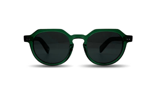 Featuring a transparent green frame, black smoke colored lens and subtle gold inscription logo effects.