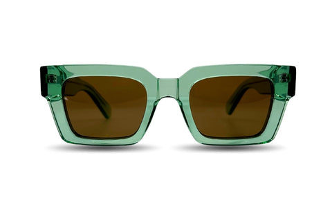 Featuring a transparent green frame, light brown colored lens and subtle gold inscription logo effects.