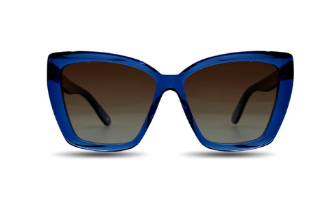 Featuring a transparent blue frame, gradient brown lens and subtle gold inscription logo effects.