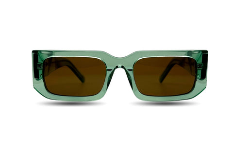 Featuring a transparent green frame, light brown lens and subtle gold inscription logo effects.